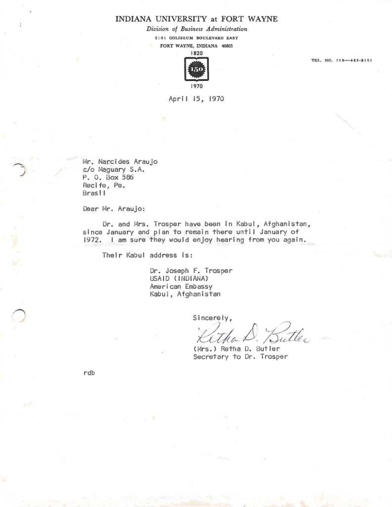 A Sra. Butler informa que o Dr. e a Sra. Trosper estão em Cabul, Afeganistão, desde janeiro de 1970 e pretendem ficar lá até janeiro de 1972. Ela fornece o endereço deles em Cabul e sugere que o Sr. Araújo entre em contato.